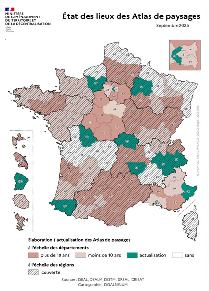 Ce chantier de connaissance des paysages français par les atlas, initié par le ministère chargé de l’environnement en 1994, est aujourd’hui presque finalisé en France, avec une mise à jour régulière et l’émergence de nouveaux outils de représentation de ces derniers.