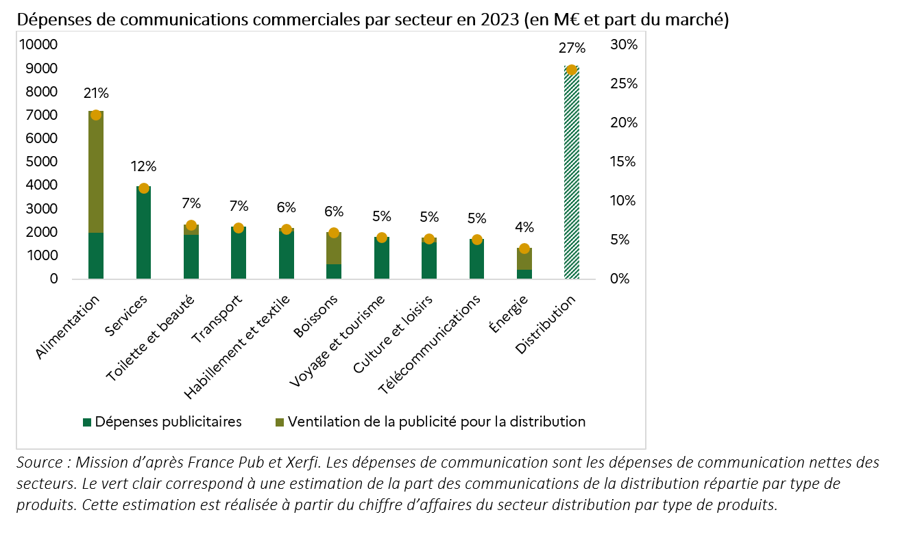 - Les secteurs les plus présents (alimentation et automobile) cumulent 34 % des dépenses publicitaires mais aussi 36 % des émissions de carbone du bilan de la France
